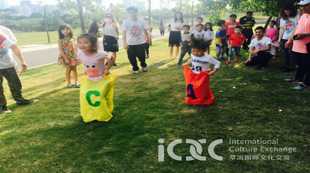 小朋友们先选择自己喜欢的颜色的袋子,然后把自己装进去哈哈,拉着两侧的手提处蹦跳起来,谁先到达终点谁就胜利了。